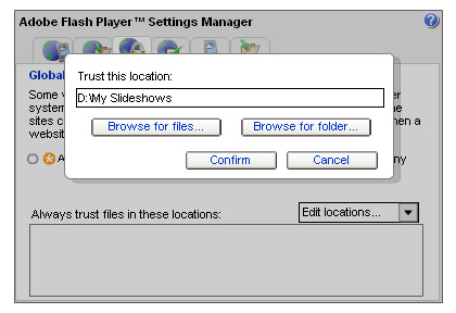 After you add trusted locations, you must restart the local SWF content by either refreshing the browser or restarting the player.
