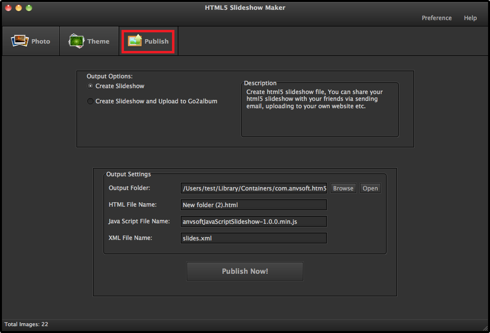 Publish HTML5 Slideshow: The "Publish" tab will bring you to the last step. You need to choose the "Output Options"first and then set the "Output Settings". After that, you can let the HTML5 Slideshow Maker start producing the output files with a click of the "Publish Now" button.