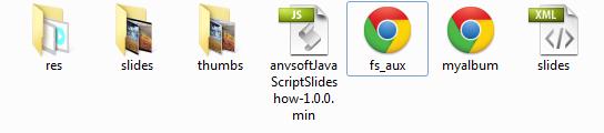 After you publish your HTML5 slideshow, the HTML5 Slideshow Maker will create 3 folders and 4 files for you. The output files of your photo slideshow contains the JScript Script File, XML Document, and HTML Document.